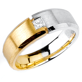 14K WHITE AND YELLOW GOLD BAND 12.50 GRAMS, SET WITH ONE PRINCESS CUT DIAMOND TOTAL WEIGHT 0.18 CT.